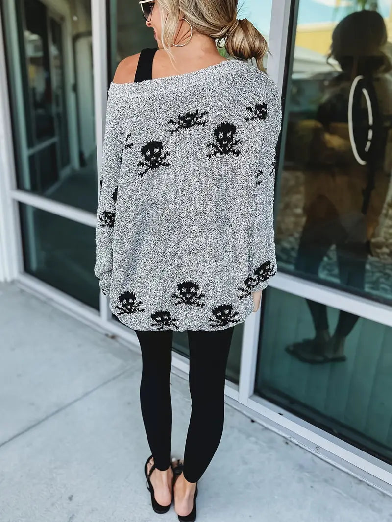 Cozy Skull Heart Crochet Sweater for Women: Chic One-Shoulder Pullover with Stretchy Comfort and Unique Back Design