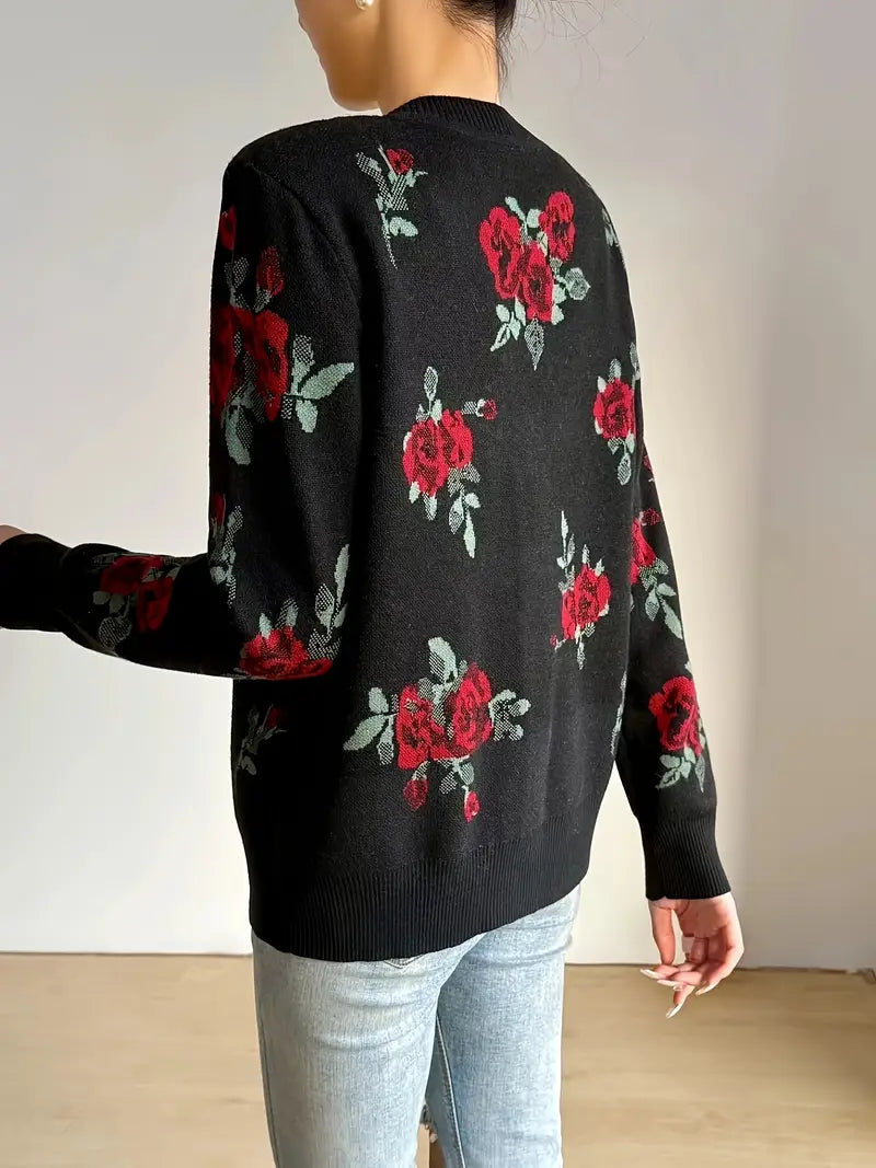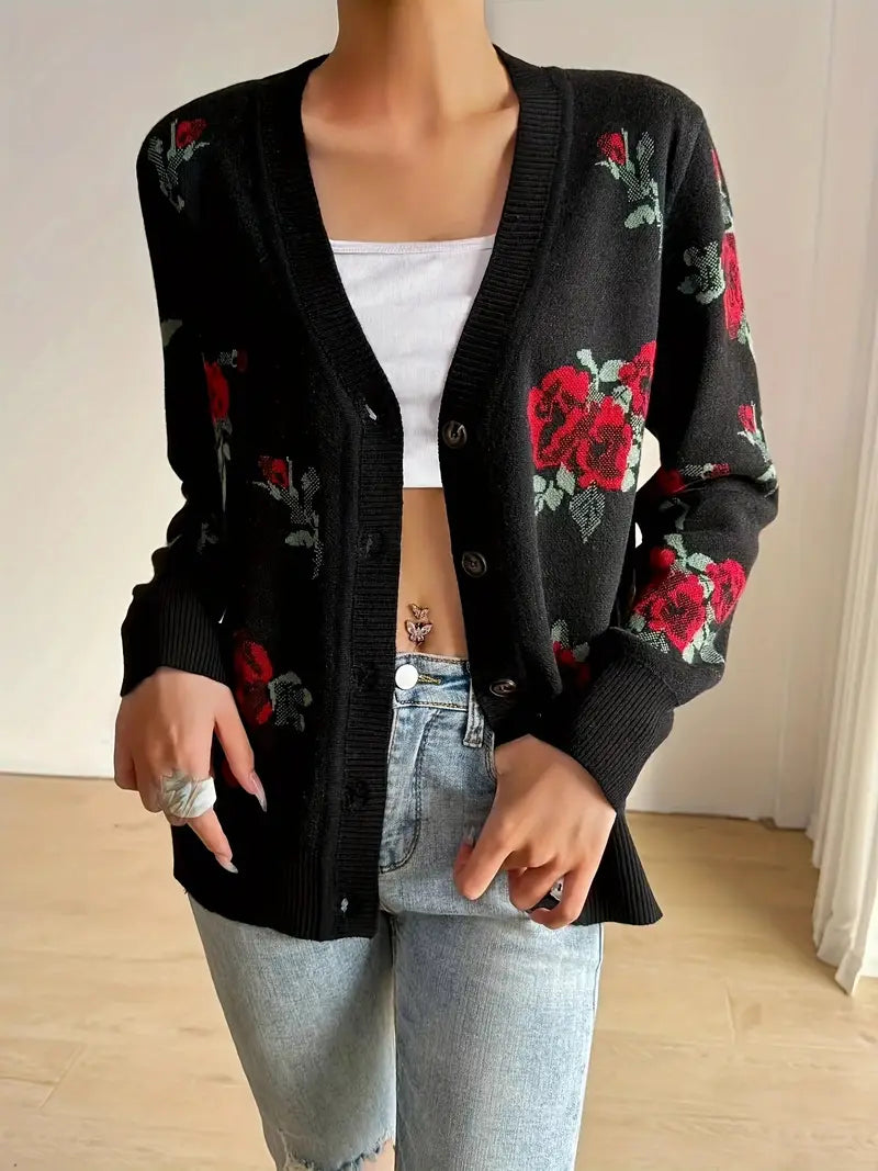 Floral Knit Cardigan for Women - Casual V-Neck Button-Up Sweater for Fall & Winter