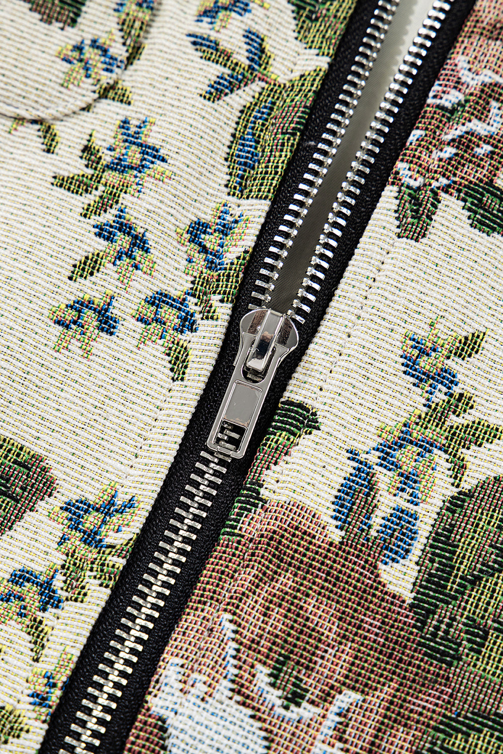 - Delicate floral prints adorn this jacket, adding a touch of femininity to the versatile hue.
