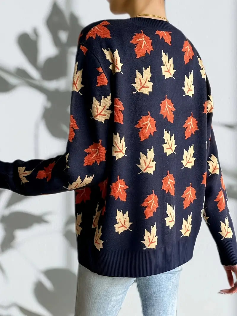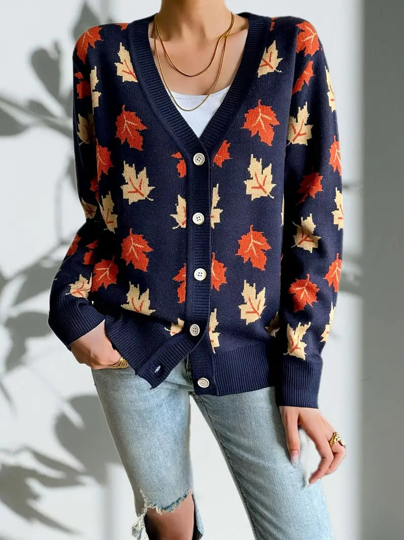 Women's Casual V-Neck Maple Leaf Pattern Cardigan Sweater for Fall & Winter